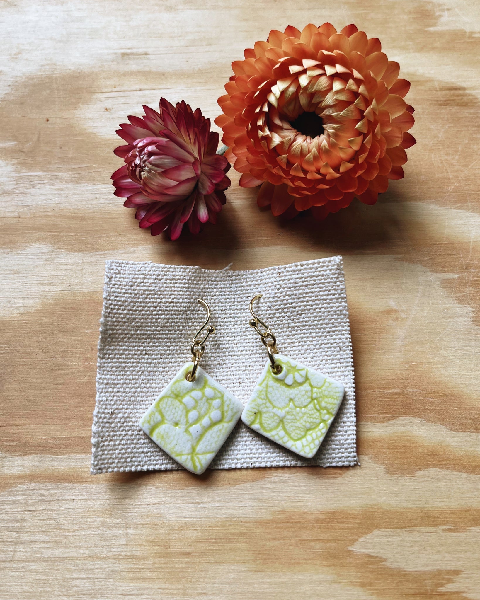 Small squares with real lace pressed into porcelain and hand painted a springy shade of chartreuse.