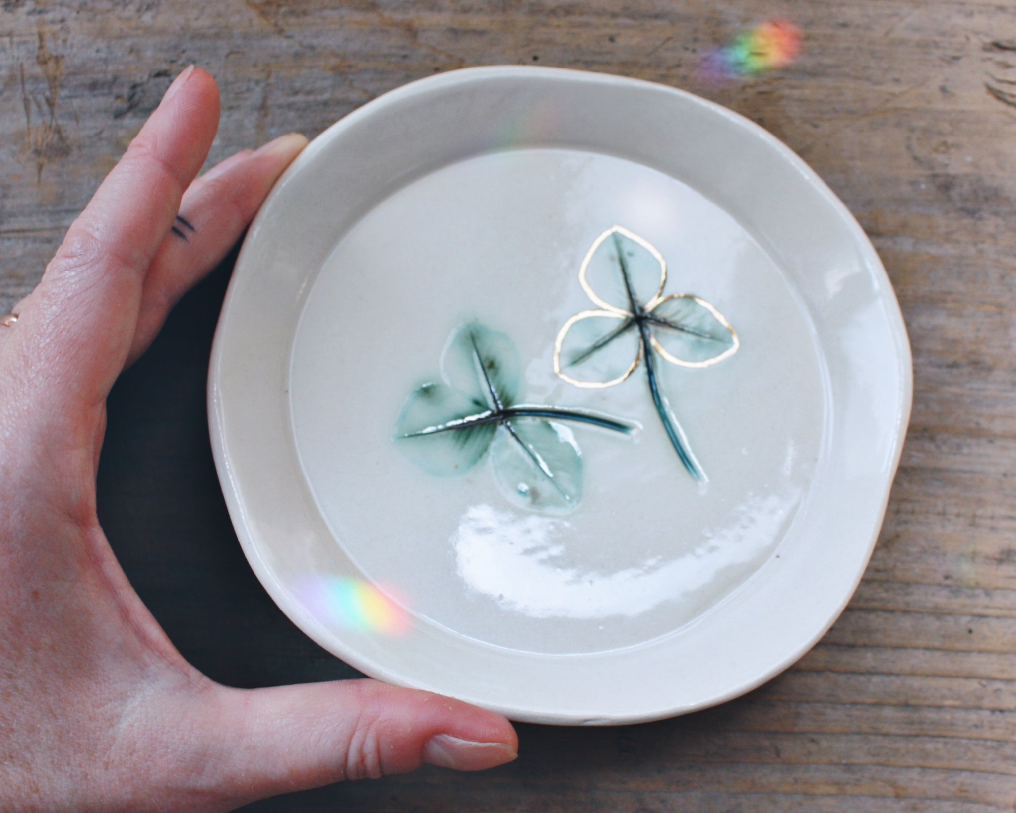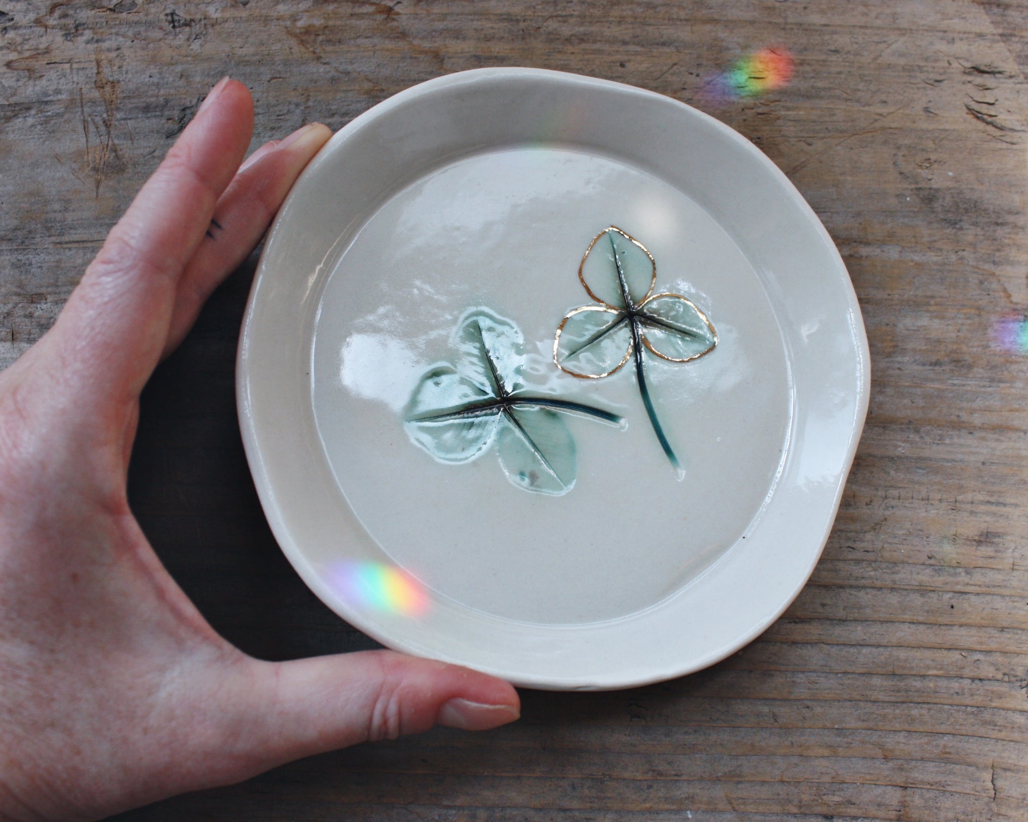 The most adorable little plate with real clover pressed in. Perfect for holding little do-dads or a candle or two.