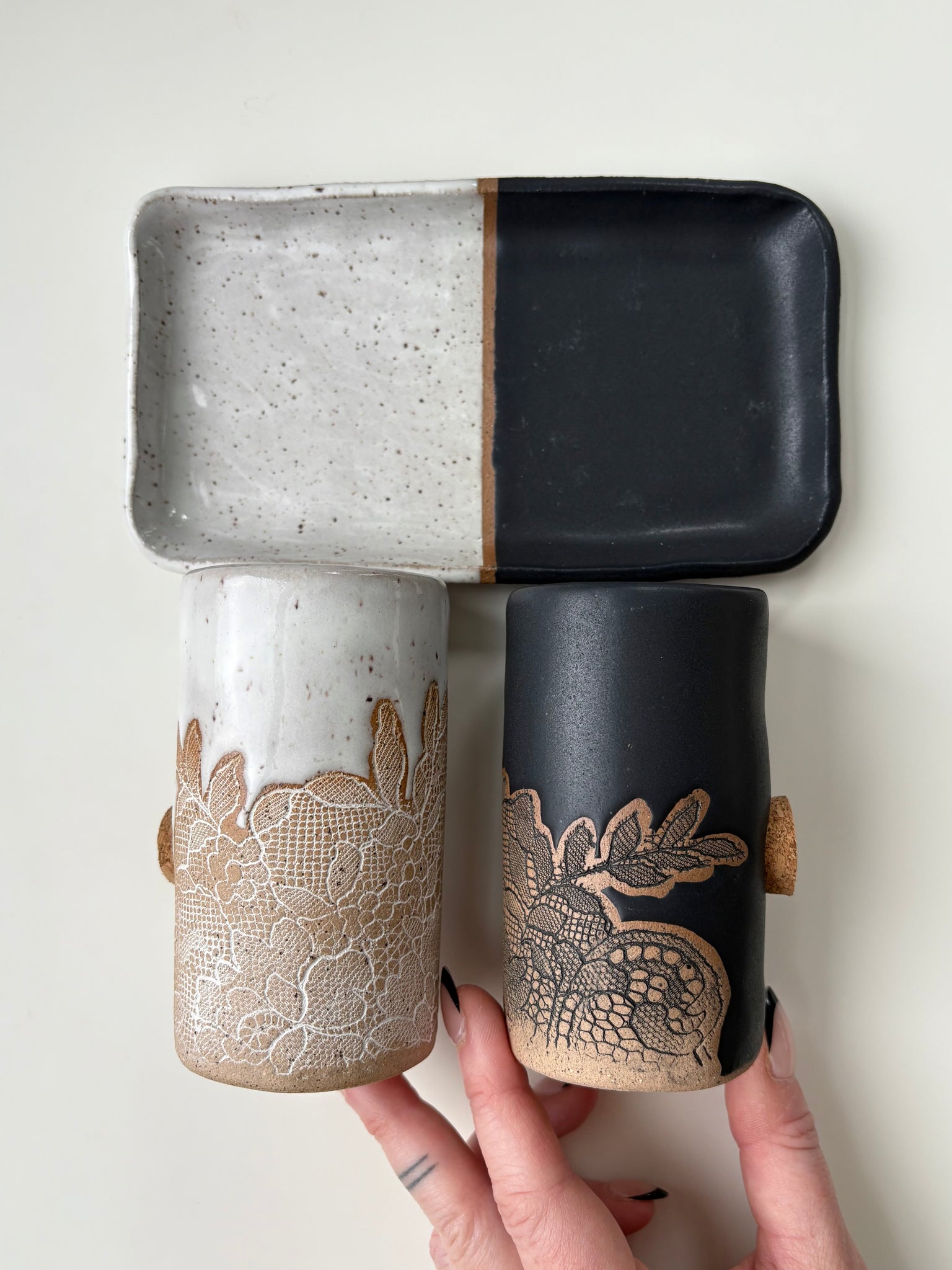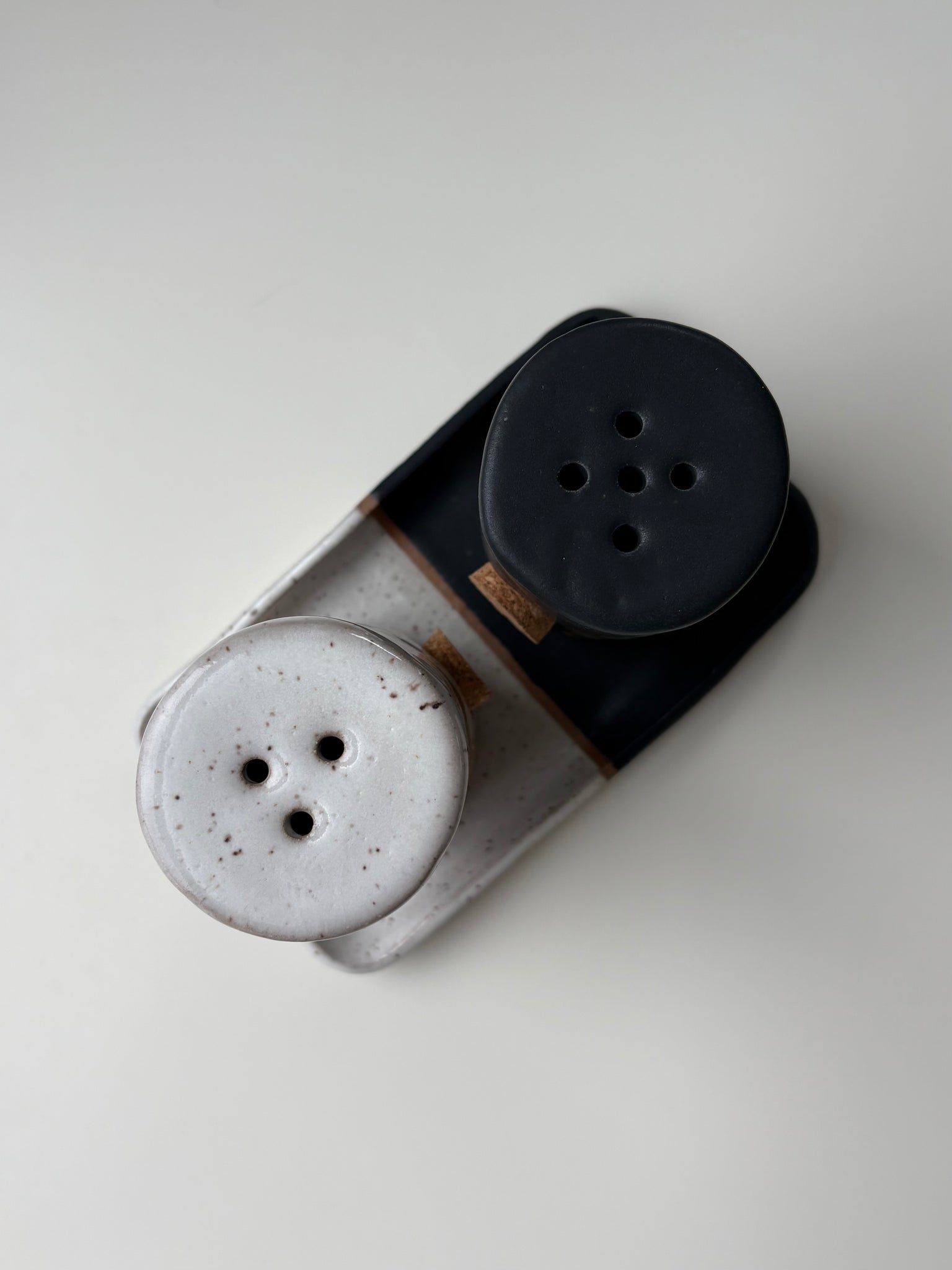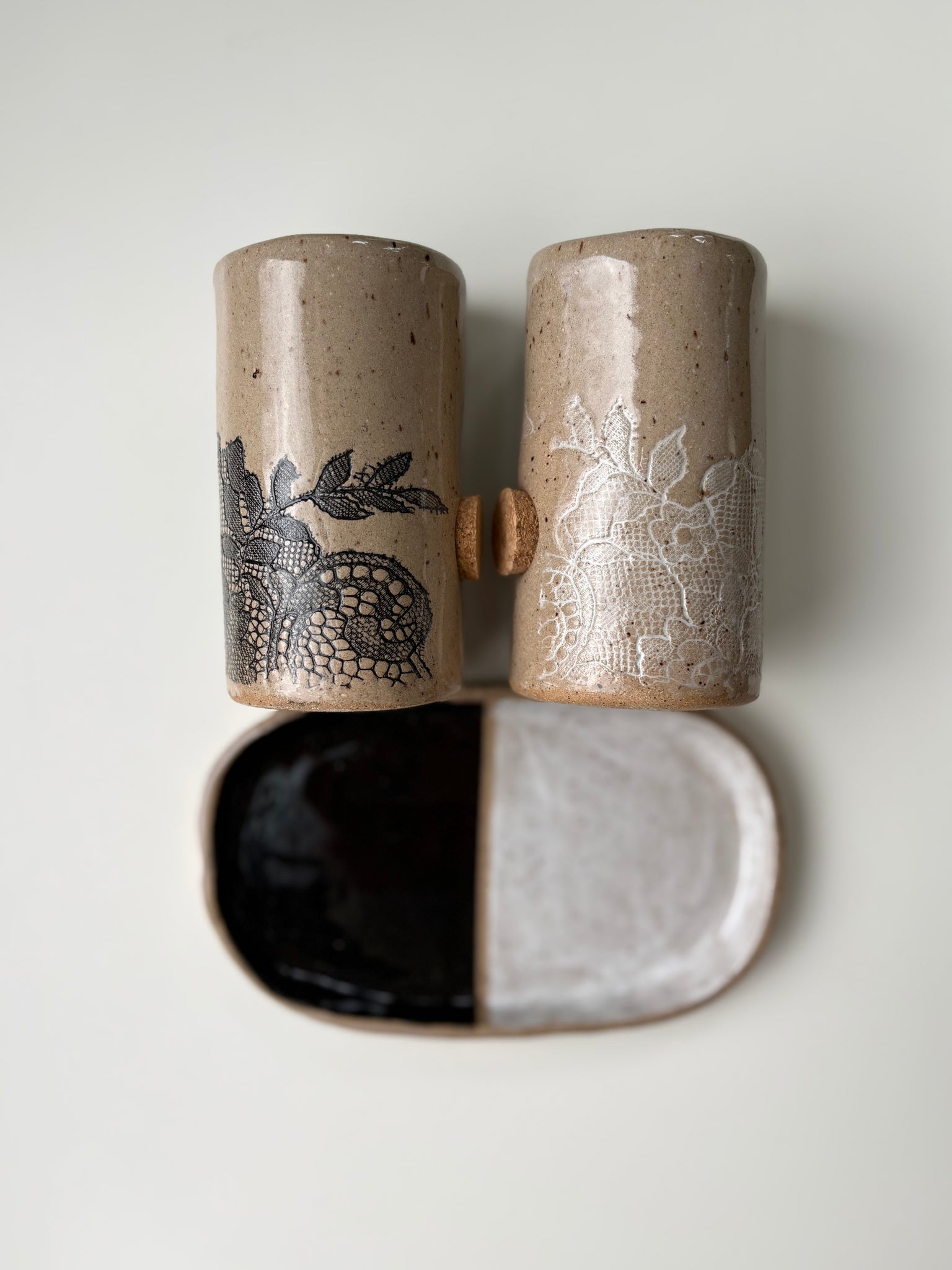 Speckled stoneware salt & pepper set - in either solid black and white glaze or glossy clear glaze. Both with matching real lace pattern and display dish.