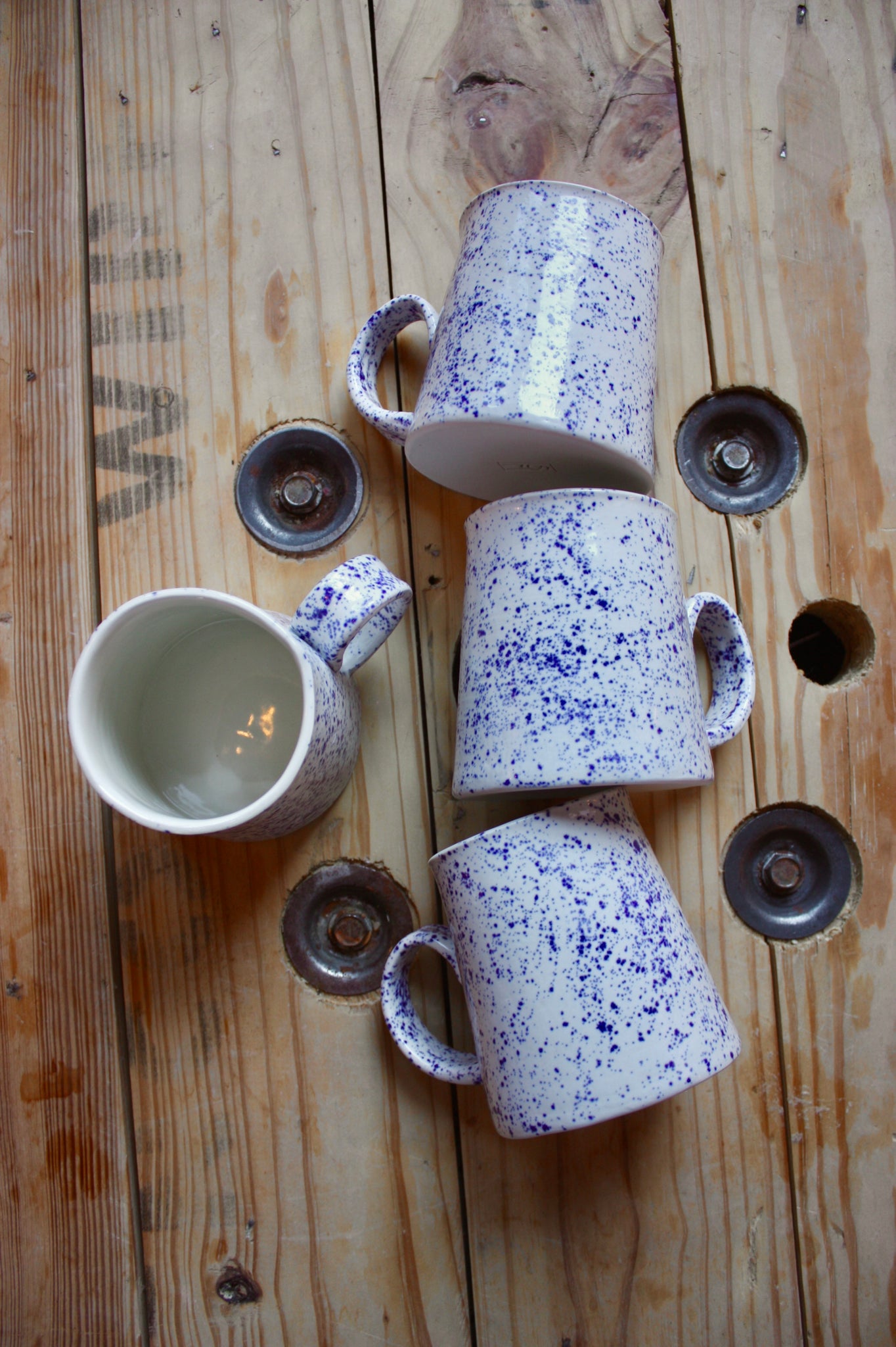 Porcelain with a fun, blue splatter glaze - simple and classic.